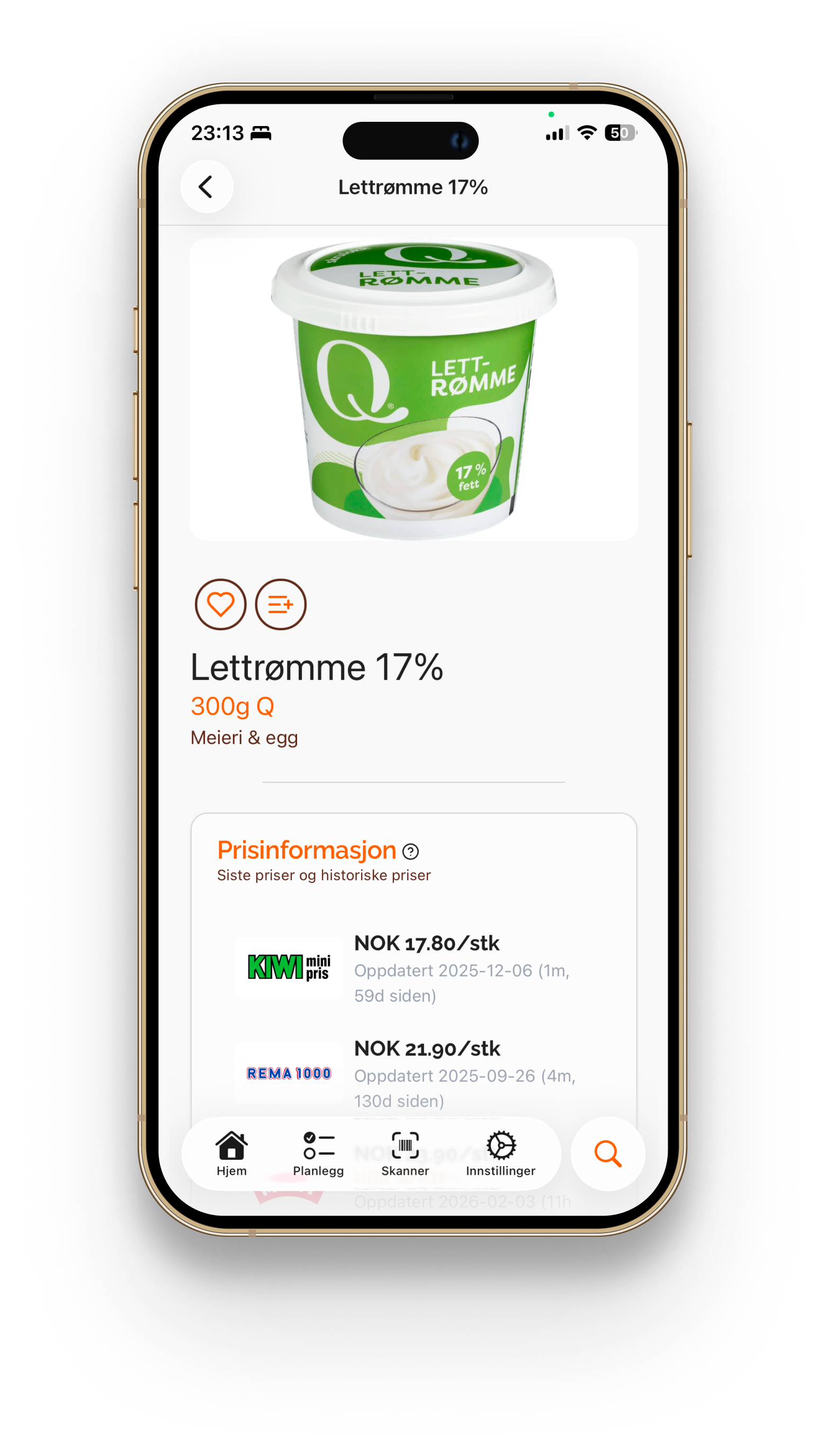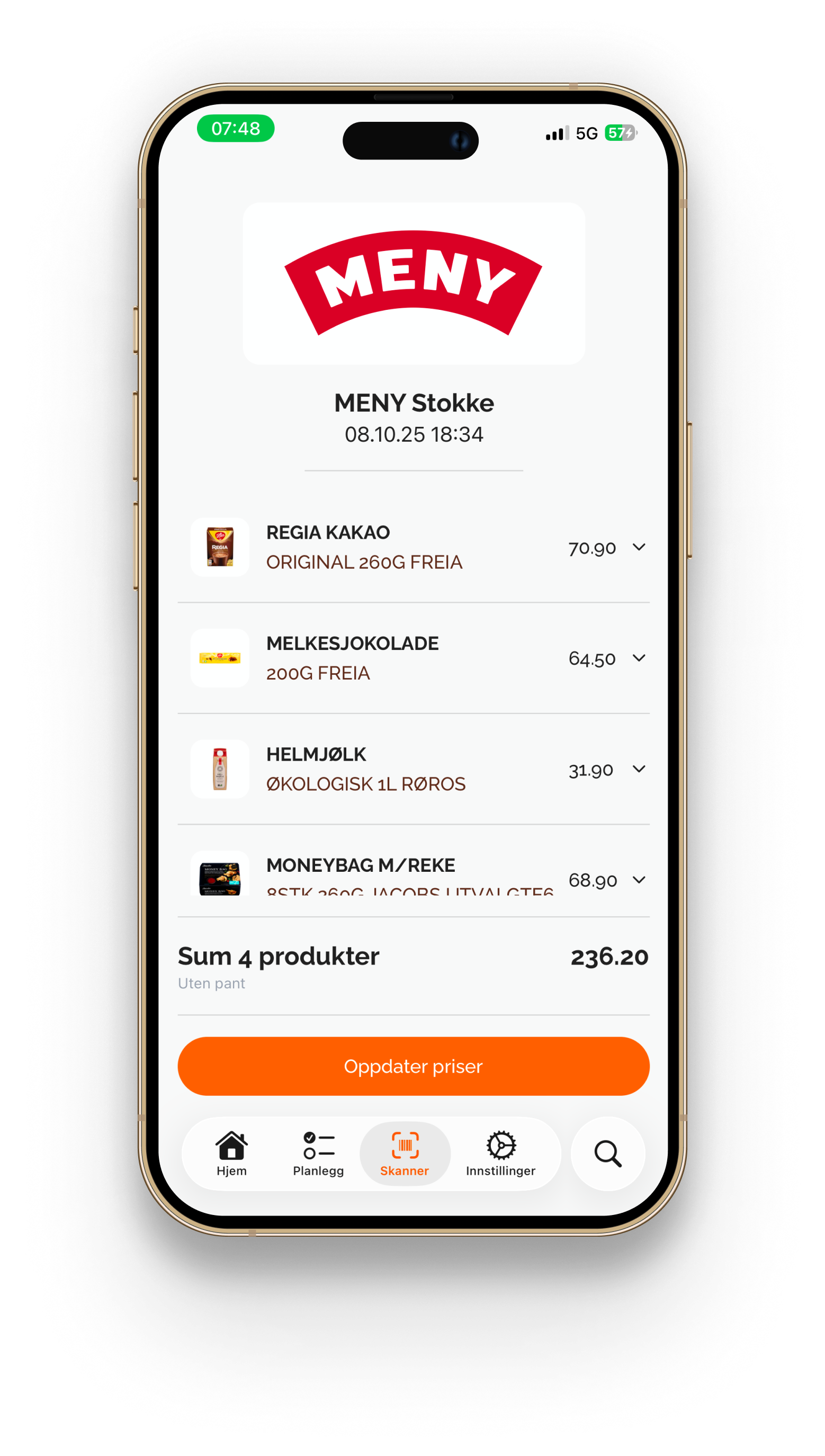 Bruk kvitteringsscanner for å scanne kvitteringer eller gå full prisjeger-modus; ta bildet av strekkode eller prislapp i butikk for å oppdatere priser selv!